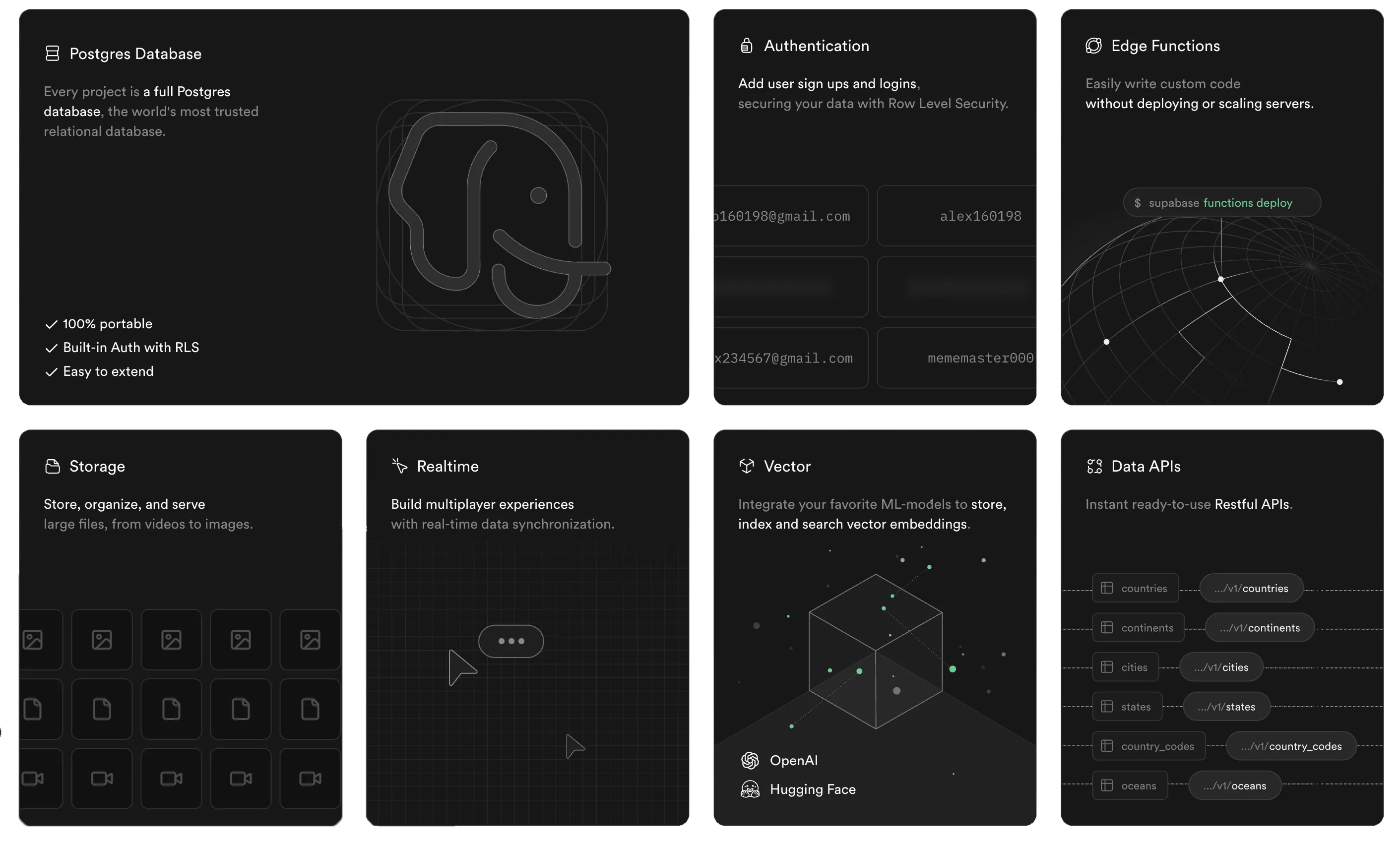 Parfait pour les développeurs solos ou auto‑entrepreneurs qui veulent lancer rapidement un produit ou un prototype. Supabase offre une base Postgres complète, une authentification intégrée et des API instantanées sans configuration serveur.